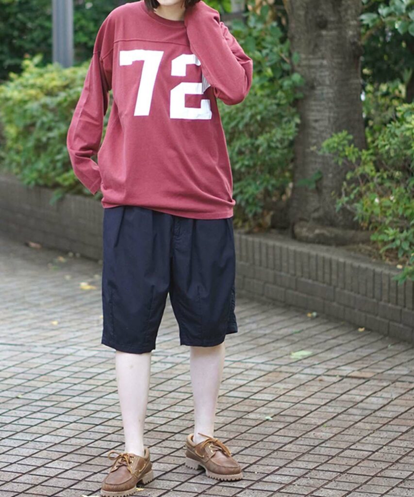 ハーフパンツではないですが、ゆとりあるパンツシルエットにも親和性は高くハーフパンツも問題なくこなします。