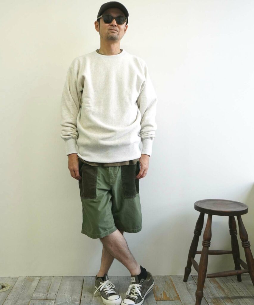 無地でシンプルだからこそ、カーゴショーツやデニムショーツ、きれいめなチノショーツまで幅広く合わせられるのもポイント。