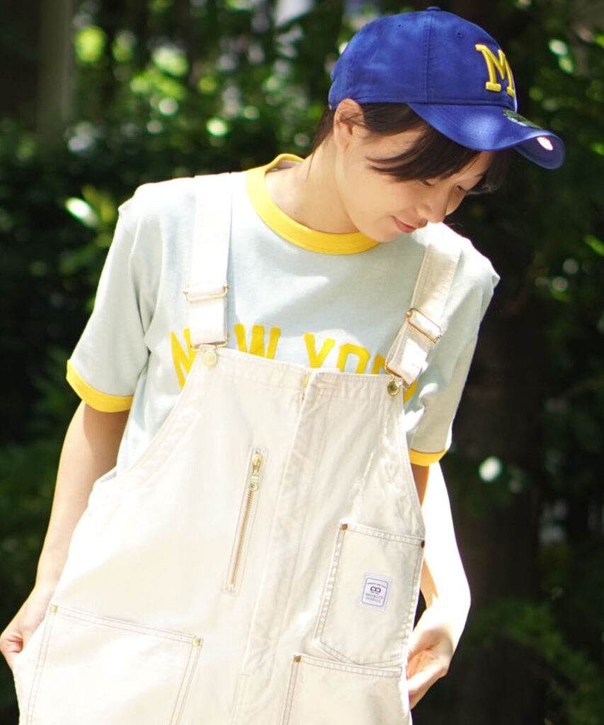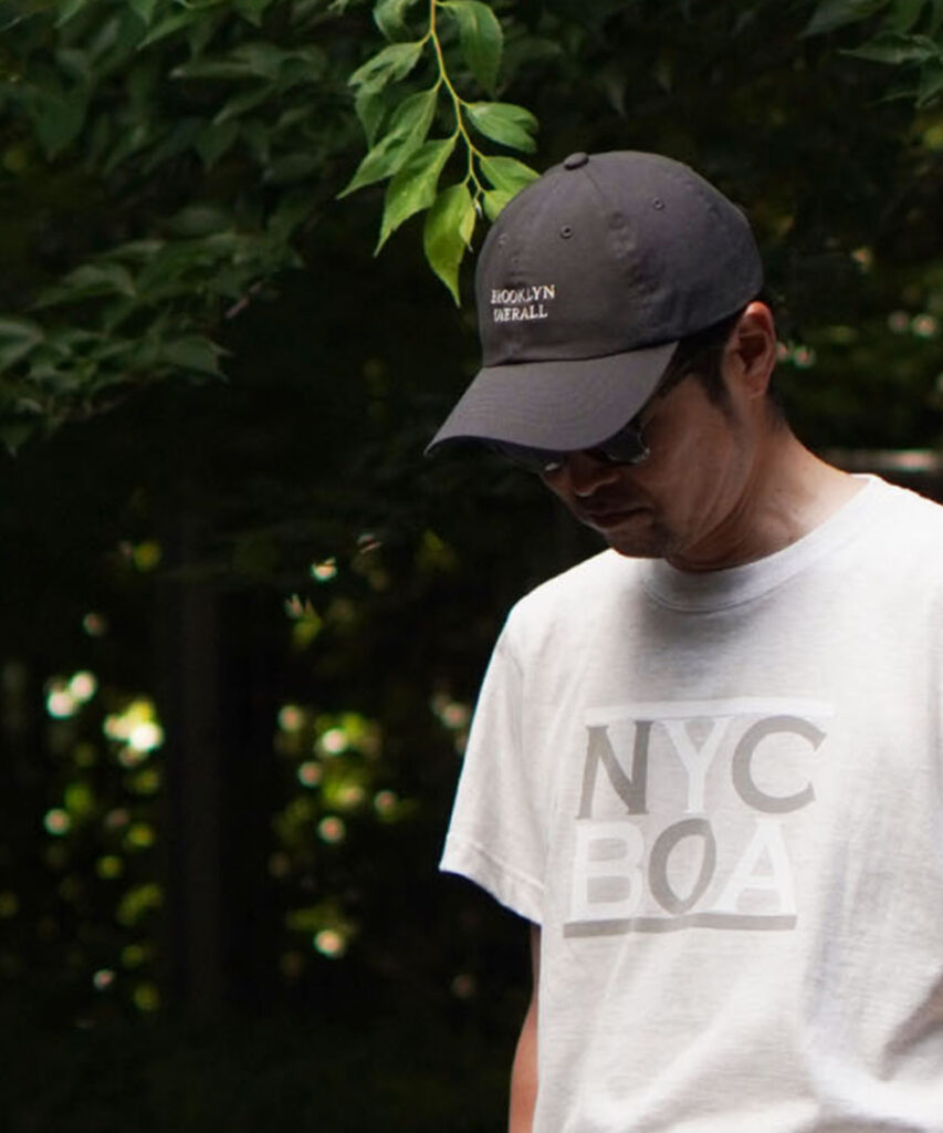 まずご紹介するのは、ブルックリンオーバーオールのシンプルなアメリカンテイストなキャップです。フロントにはシックでエレガントな書体のブランドロゴがあしらわれた、ラフなTシャツスタイルに落ち着きと大人感をプラスしてくれます。