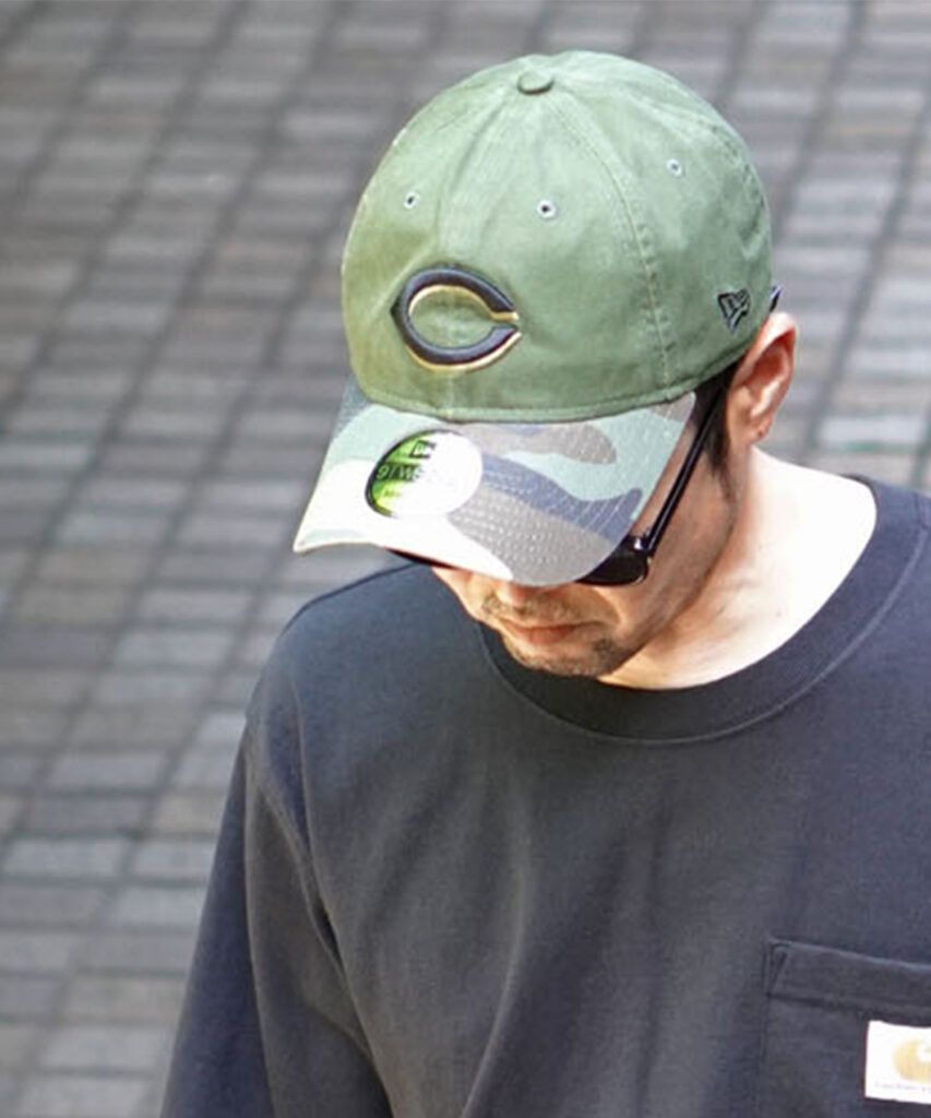 最後にご紹介するのも、ニューエラの定番モデル「9TWENTY」です。こちらは、迷彩柄のつばとカーキのボディがミックスされた、ワイルドでハンサムなカラーリングが特徴。