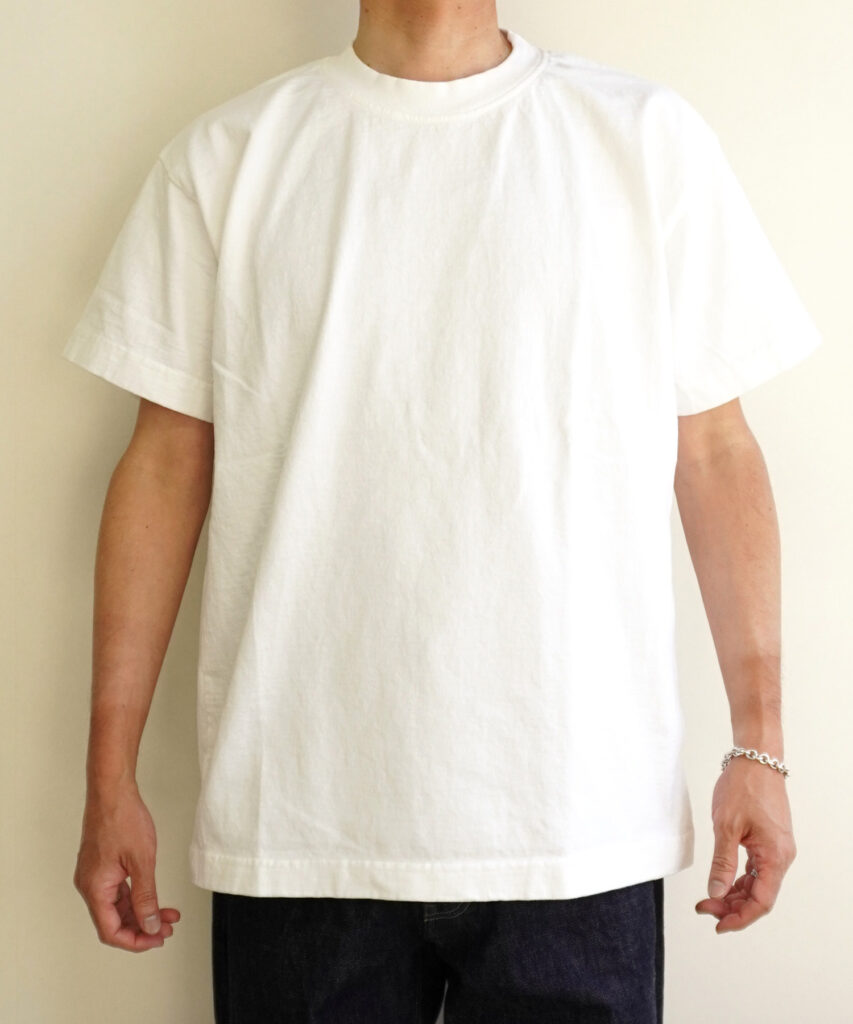 その歴史の中で培われた技術と品質は、Tシャツにも惜しみなく注がれています。特にUSA製のTシャツは、肉厚ながらも柔らかな肌触りが特徴。