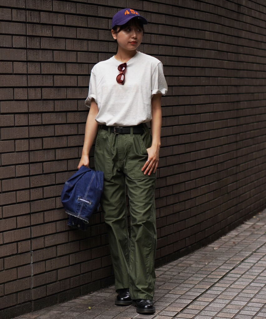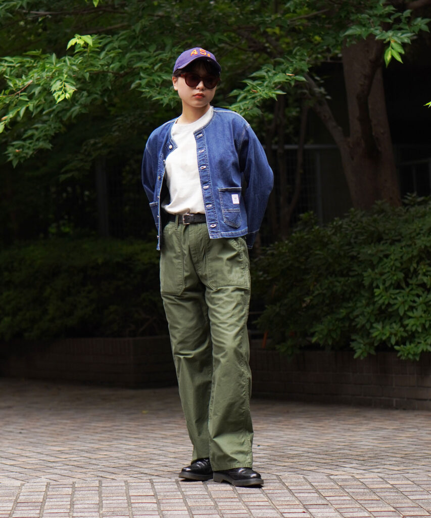 本来はメンズワークウェアとして設計されたこの1本を、今回は女性スタッフが試着し、コーディネートに取り入れてみました。
