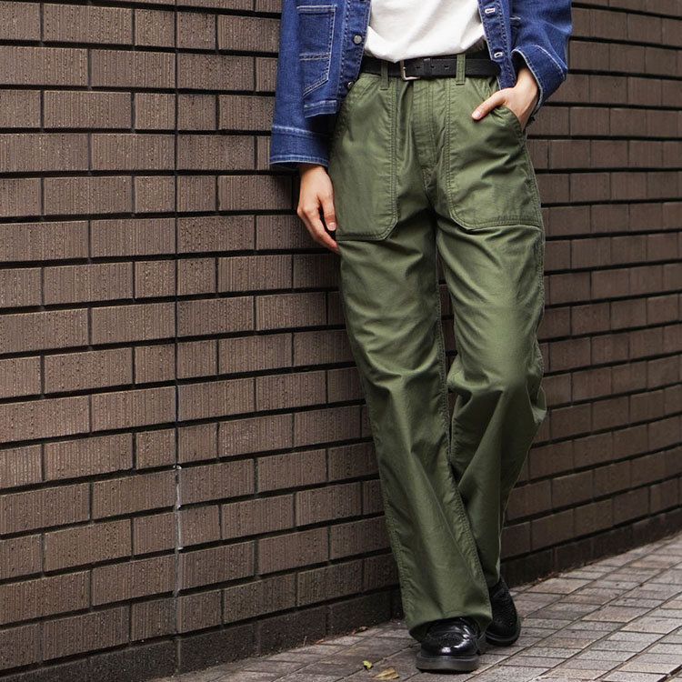 ゆったりとした腰まわりと、ストンと落ちる直線的なシルエットが、女性が穿くことで生まれる自然な抜け感を演出します。